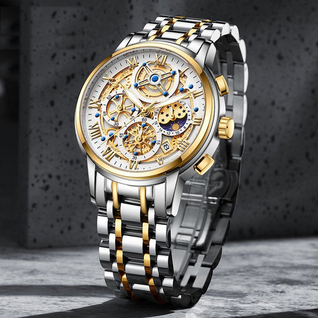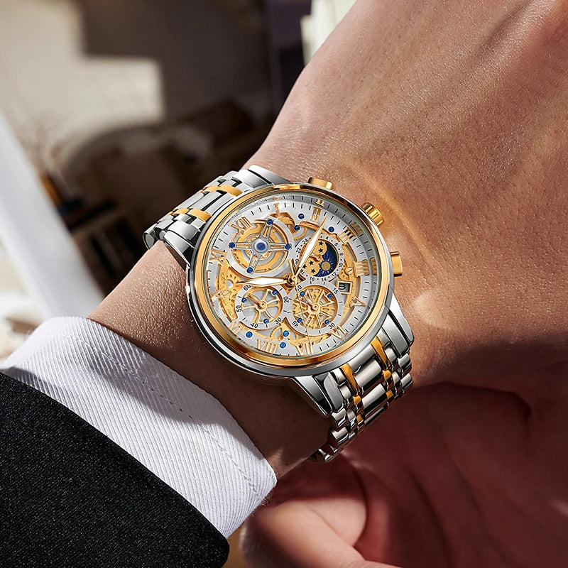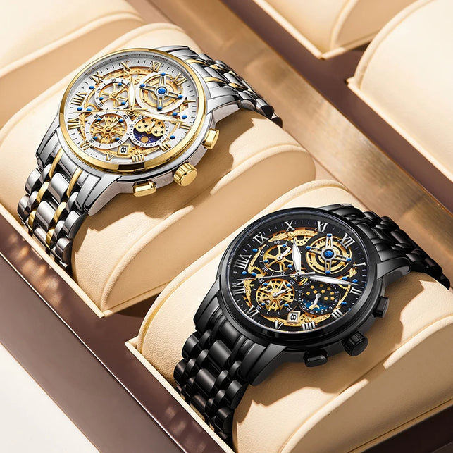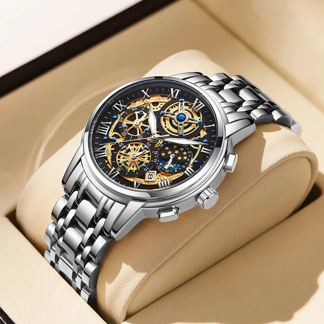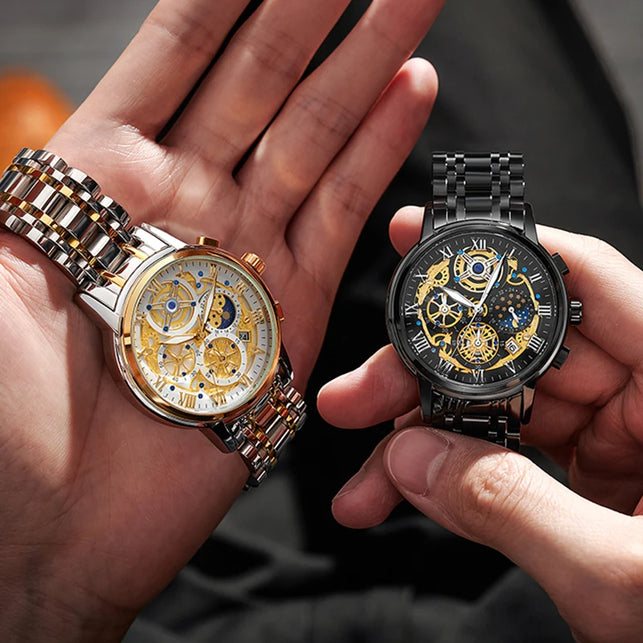 Elevate your wrist game with this Men's Luxury Skeleton Quartz Watch, a masterpiece that blends the timeless look of traditional watchmaking with the effortless reliability of a quartz movement. This timepiece features a captivating skeletonized dial that showcases an intricate industrial aesthetic, framed by classic Roman numeral markers for a touch of old-world sophistication. Crafted entirely from high-grade stainless steel, this watch offers a substantial feel and a brilliant polish that complements any professional or casual outfit. Unlike traditional mechanical watches, this model is battery-powered, ensuring "set-it-and-forget-it" accuracy while maintaining a high-end, complex appearance.