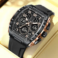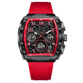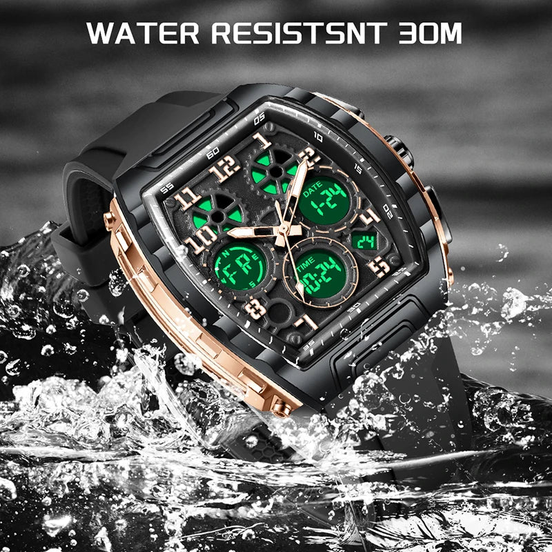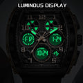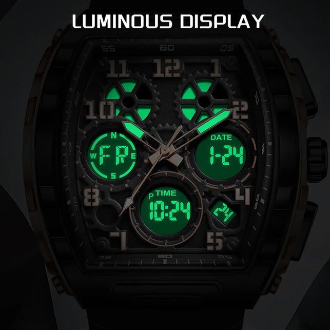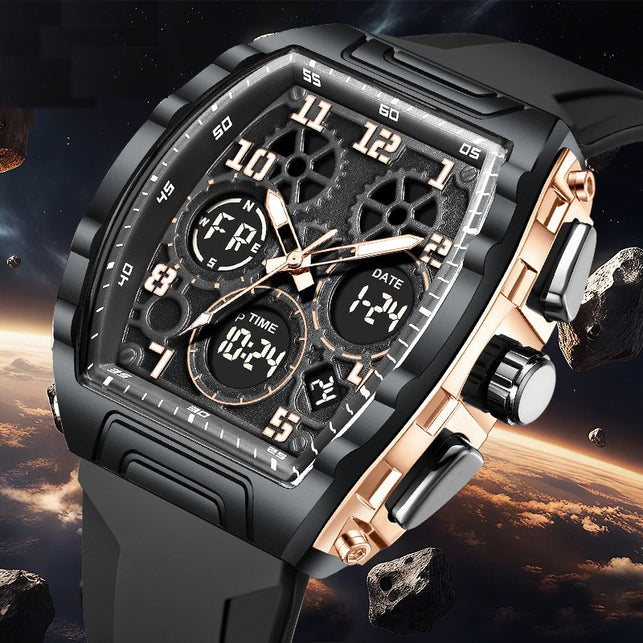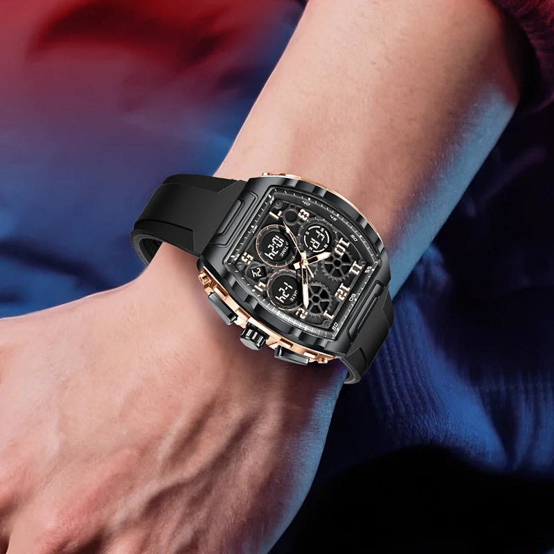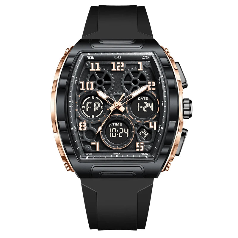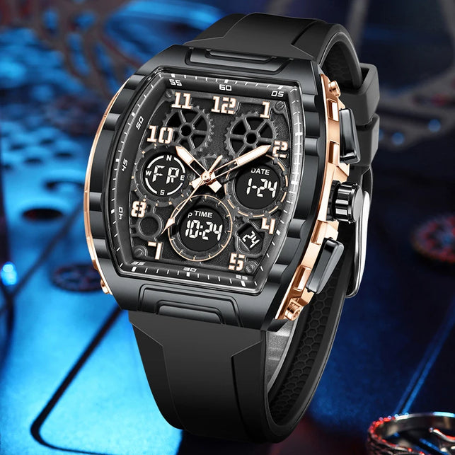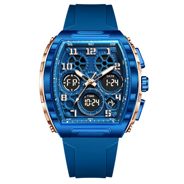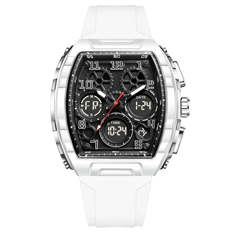 Experience the best of both worlds with this Sporty Luxury watch, featuring a powerful hybrid Quartz and Digital movement. The distinctive Tonneau (barrel-shaped) case creates a commanding presence on the wrist, offering a high-end luxury look that transitions seamlessly from active sports to casual outings. With the reliability of quartz timekeeping and the multi-functionality of a digital LED interface, you have access to a full suite of tools—including an alarm, chronograph, and backlight—all at a glance. Wrapped in a rugged silicone strap, this watch is engineered for those who demand both professional precision and modern style.